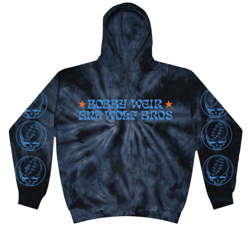 Black/Blue tie dye hoodie with Bobby Weir and Wolf Bros on the front and wolf design on the back