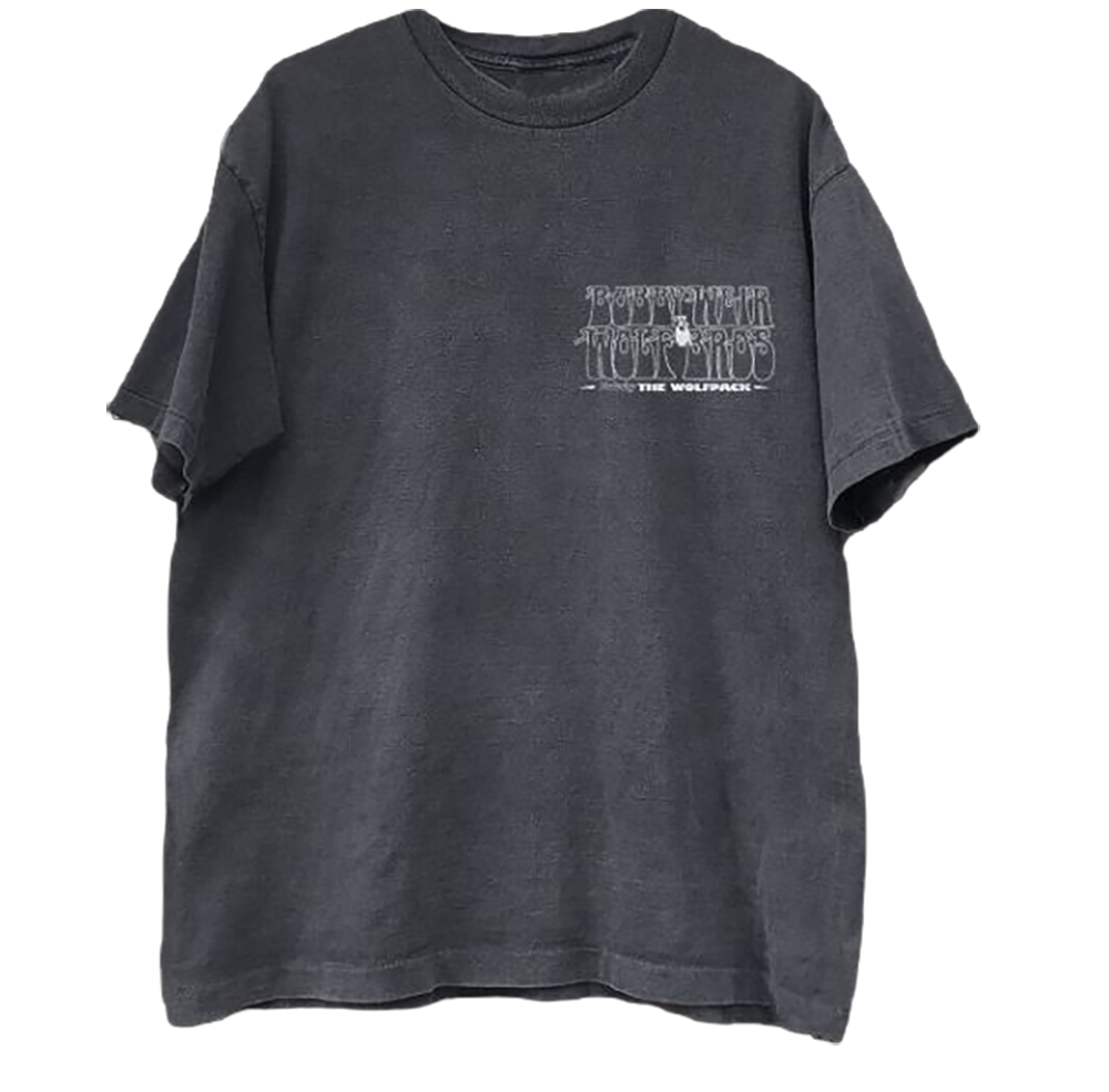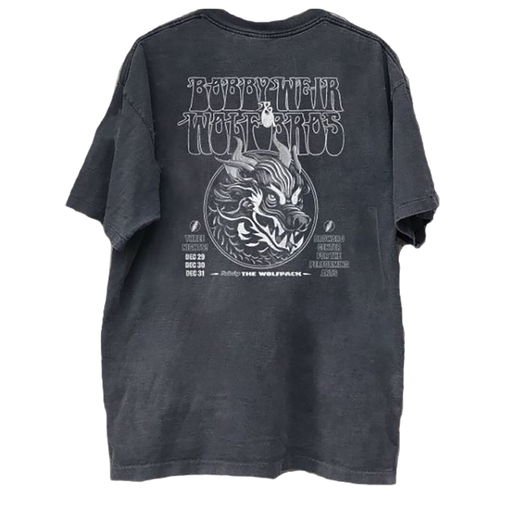 Washed Black 100% cotton short sleeve tee with Bobby Weir and Wolf Bros logo on the front and NYE 2023 dragon design printed on the back